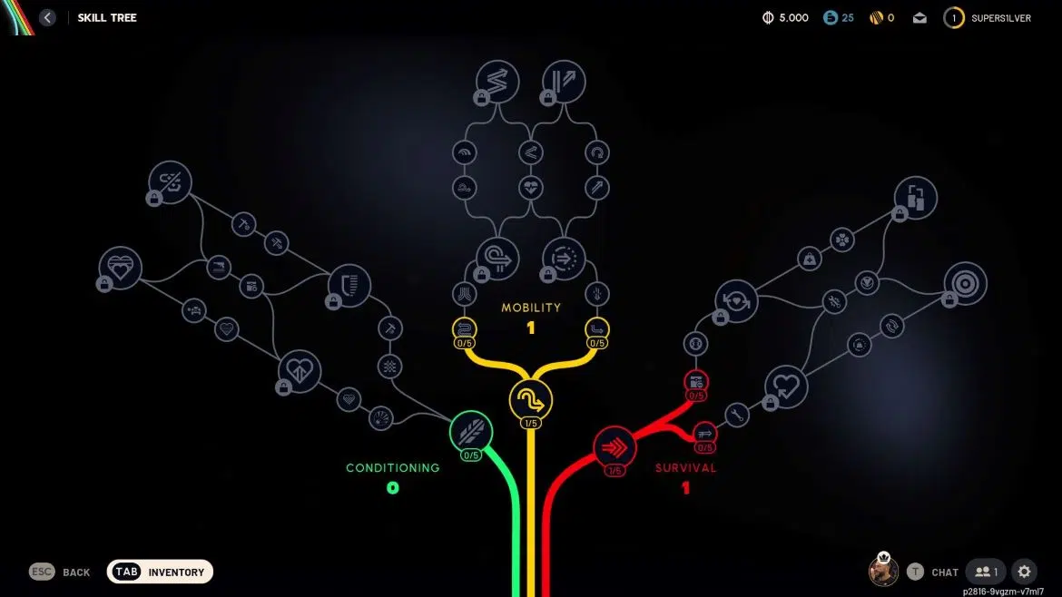 - Откроется дерево навыков игры. Инвестировать можно в три ветки — кондиционирование (зелёная), выживание (красная) и мобильность (жёлтая). Тратьте очки навыков на нужные умения. Продвигаться придётся снизу вверх по ветке, где верхние навыки самые мощные.