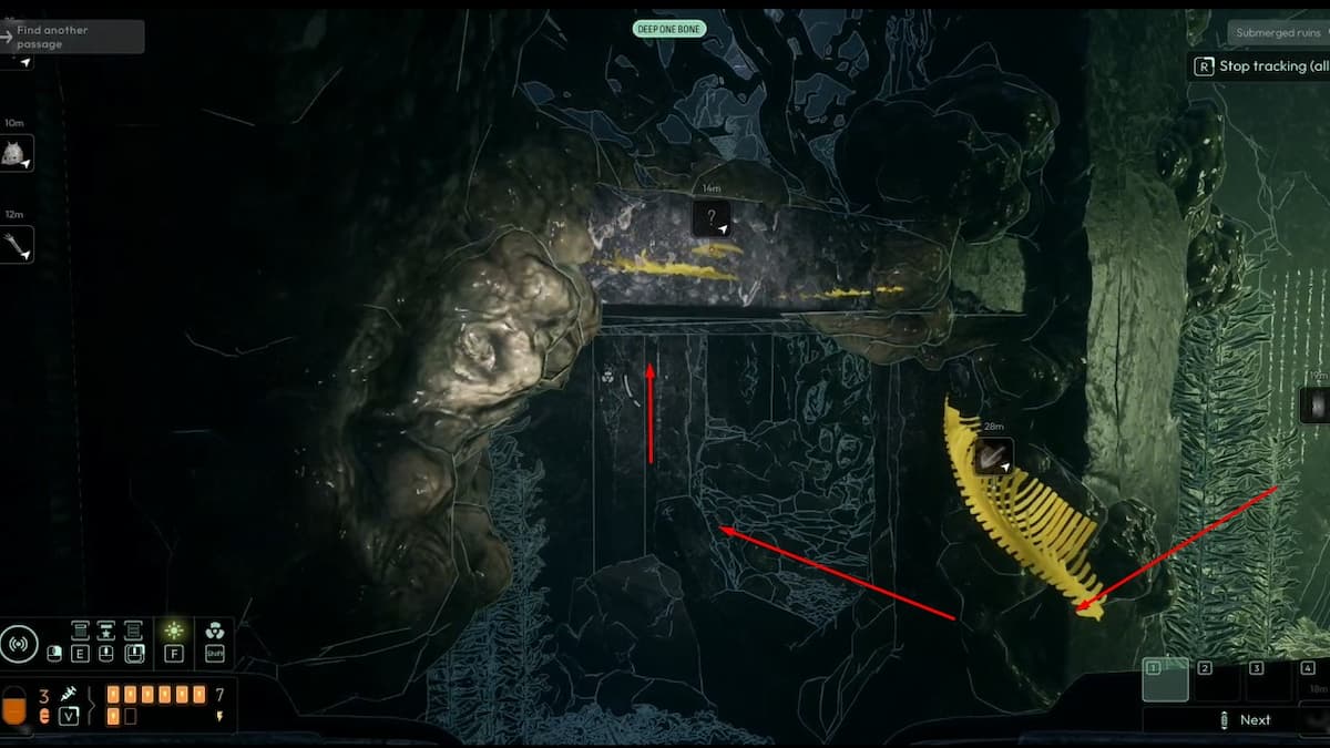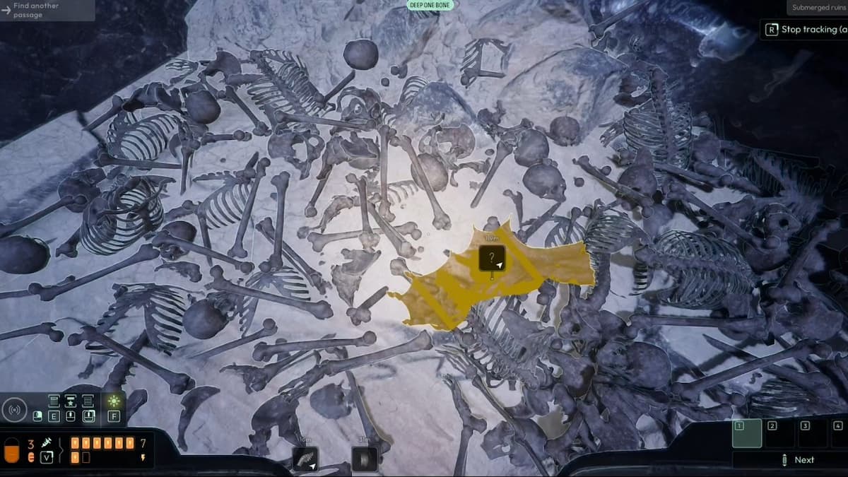 Через туннель нельзя пройти с чешуёй Глубоководного. Нырните на дно и осмотрите кости существа на грунте. Проанализируйте их, чтобы получить новую частоту: Кость Глубоководного.