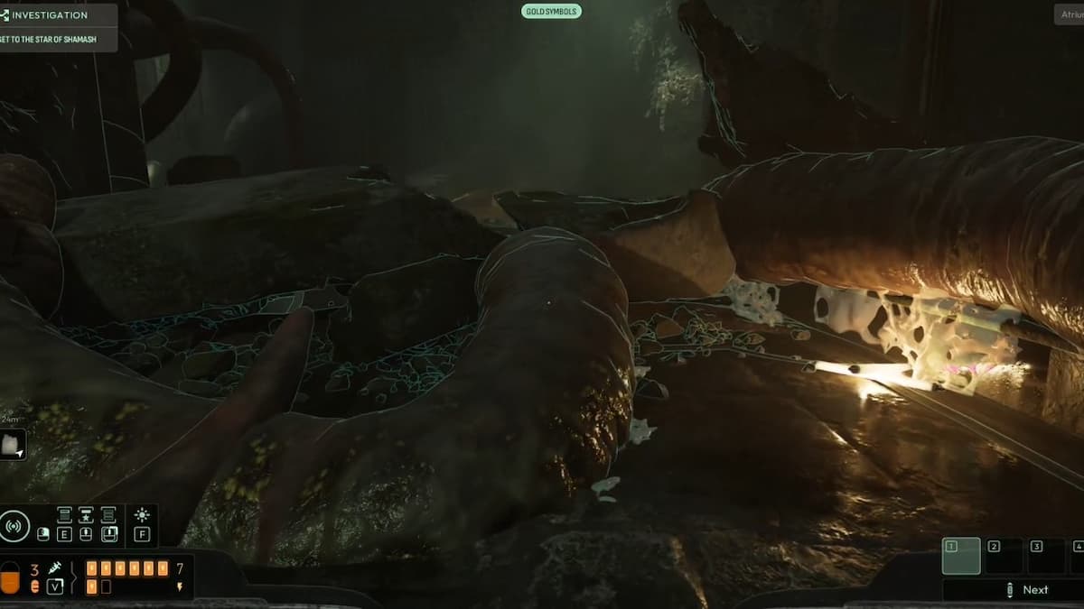 Нужно найти больше подсказок, чтобы понять, как это сделать. Сразу рядом с уликами используйте частоты Сердце Шоггота, Макропланктон и Человеческая кровь, чтобы проявить невидимое щупальце для перехода.