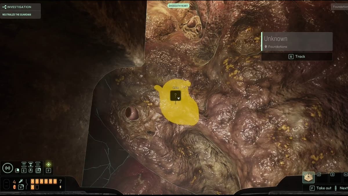 Спуститесь вниз туда, где было тело Карла. Используйте частоту Сердце Шоггота, чтобы найти сердце Стража. Затем используйте три частоты, чтобы обнаружить невидимое щупальце, ведущее к сердцу. Можно забежать на него и вонзить фрагмент камня в сердце.