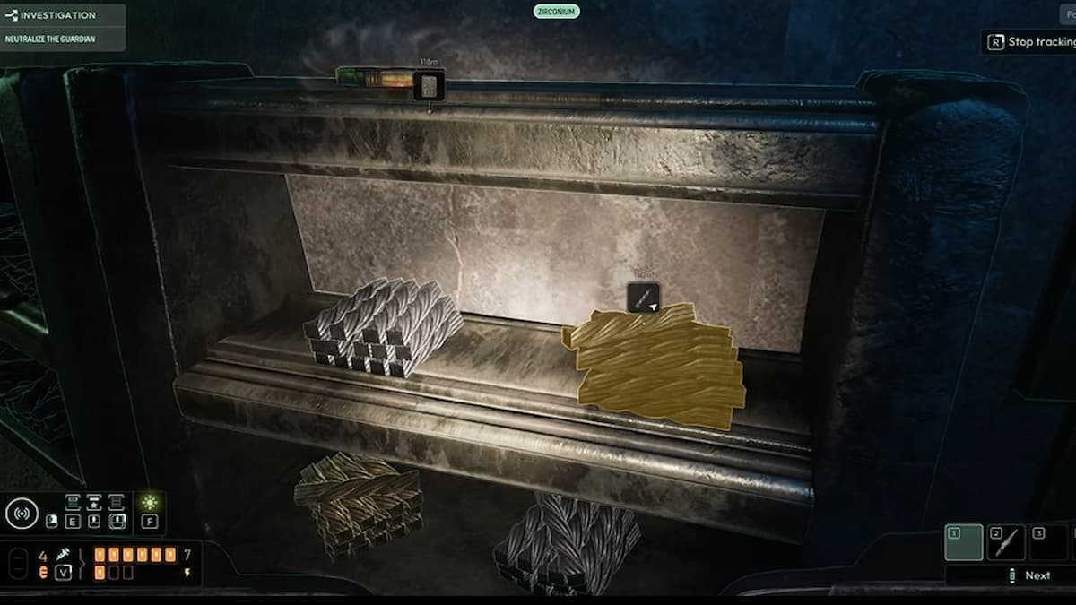 На верхнем уровне осмотрите запись Эндрю Марша на сундуке. «Страж» состоит из трёх разных веществ, и мы можем использовать три частоты, чтобы выявить невидимые части.