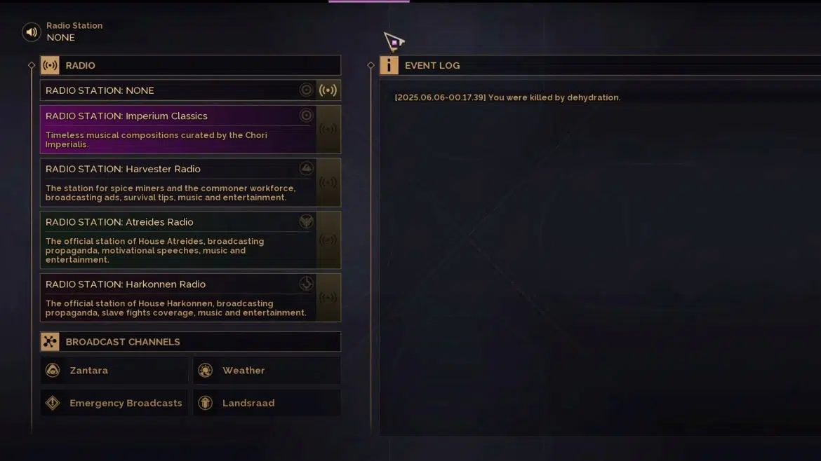- Harkonnen Radio: Это официальная радиостанция дома Харконнен. Помимо музыки и развлекательных передач, станция предоставляет множество полезной информации о лоре дома Харконнен. Также можно узнать о местоположении представителей фракции.