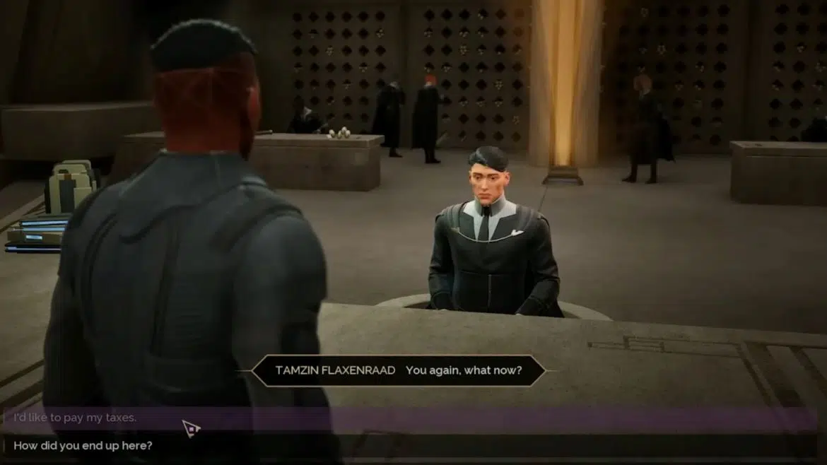 Задание завершится после разговора с представителем. Награда — 100 XP. Главное — станет ясно, как оплачивать налоги. Не расходуйте все Солари.
