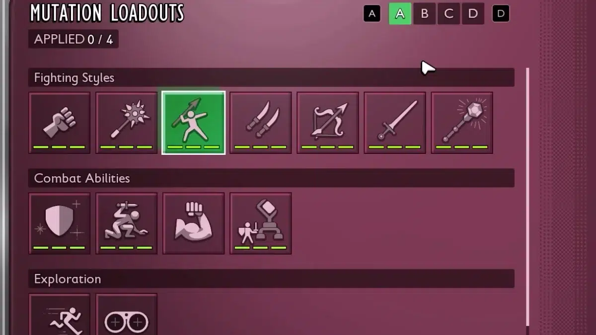 Мутации делятся на четыре категории: Бой, Исследование, Сражение и Выживание. Всего доступно 18 мутаций, из которых в начале игры можно выбрать только две. Чтобы разблокировать дополнительные слоты, найдите Молочные моляры и увеличьте максимум активных мутаций.