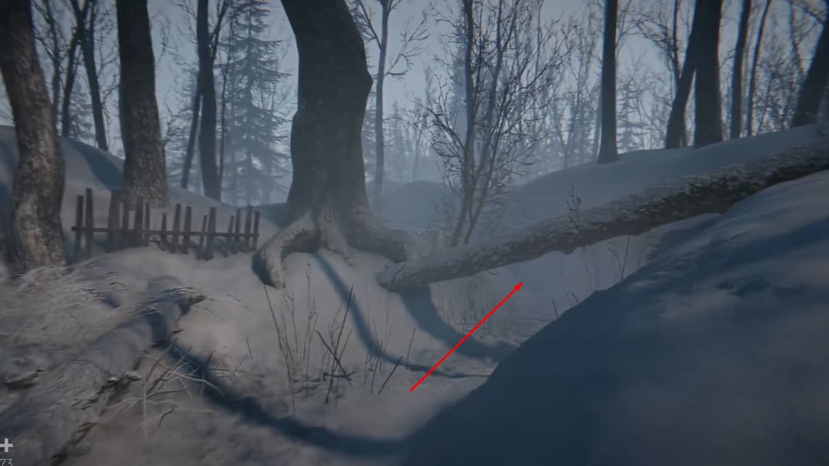 На развилке сначала сверните вправо. Ещё одно бревно преграждает путь — пройдите под ним и выйдите к небольшой деревянной хижине, утопающей в сугробах.