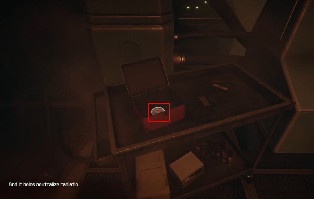 Спуститесь по лестнице: в шкафчике — медицинский инжектор (M — быстрое использование), в красном ящике у консоли — железная монета.