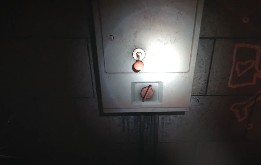 На стене справа — панель управления питанием. Вращайте циферблат мышью влево-вправо, когда загорится красная точка — фиксируйте ЛКМ. Повторите три раза.