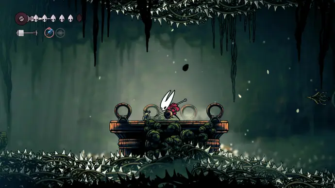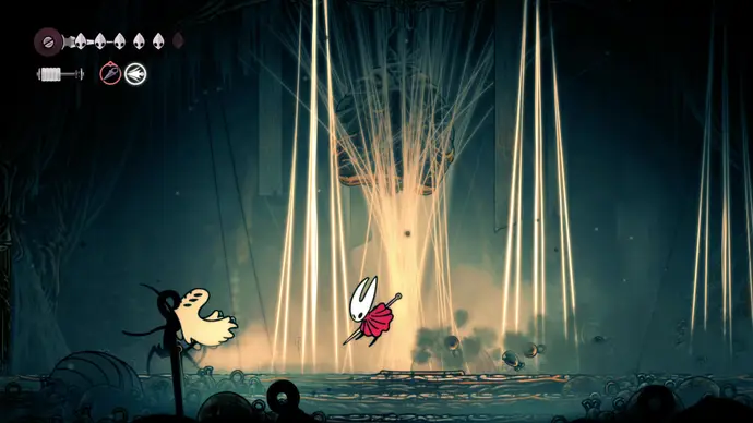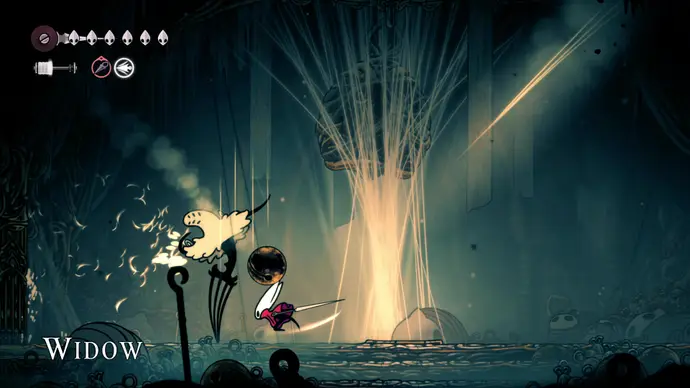 Двигайтесь до самого правого края и спуститесь в дыру. Следуйте по пути вниз, и вы попадёте на арену босса, где произойдёт короткий диалог с пугающим врагом-ткачом по имени Вдова. Разговор быстро станет враждебным, так что готовьтесь к сложному бою.