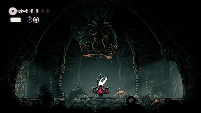 Поднимитесь по воздушным потокам наверх, и найдёте третий рычаг, охраняемый Шёлкорезом. Потяните рычаг, чтобы активировать третий воздушный поток, и поднимитесь по нему до самого верха. Подпрыгните с пил, чтобы достичь маленького закрытого пространства с большим паучьим яйцом. Разбейте яйцо, чтобы получить Шёлкопожирателя.