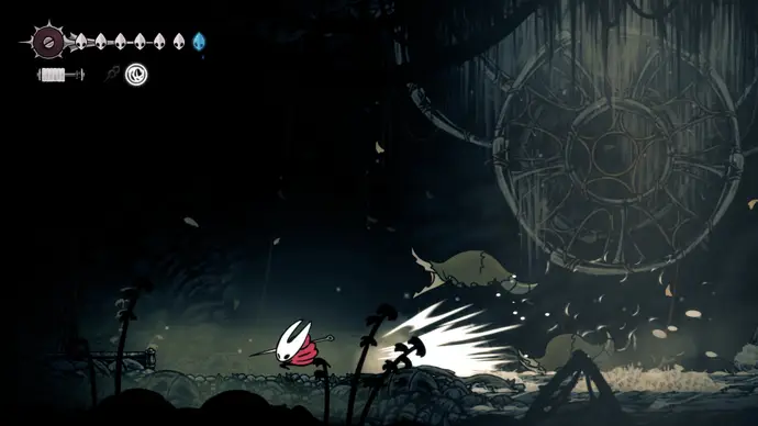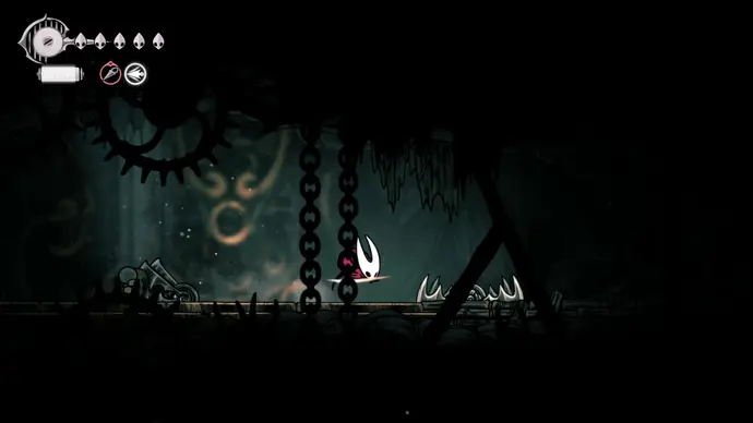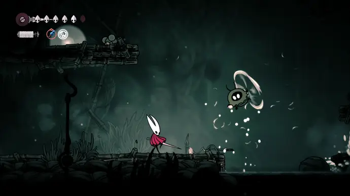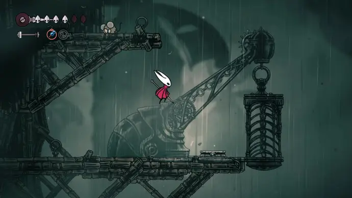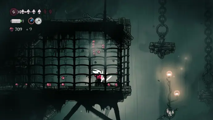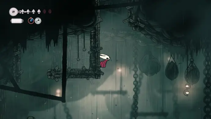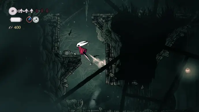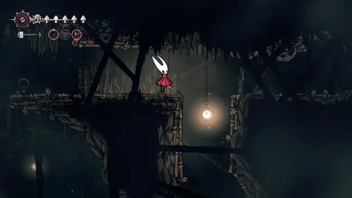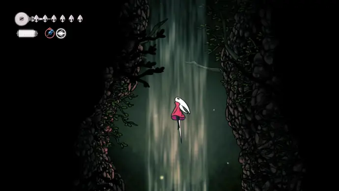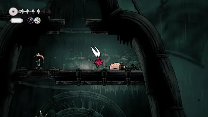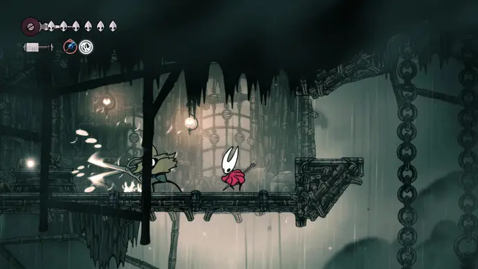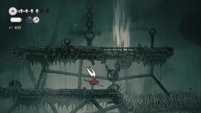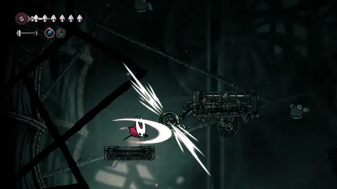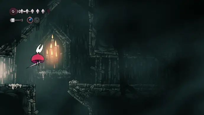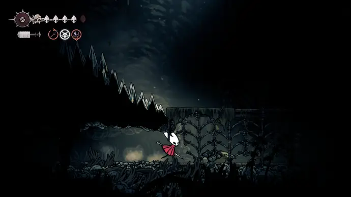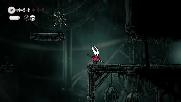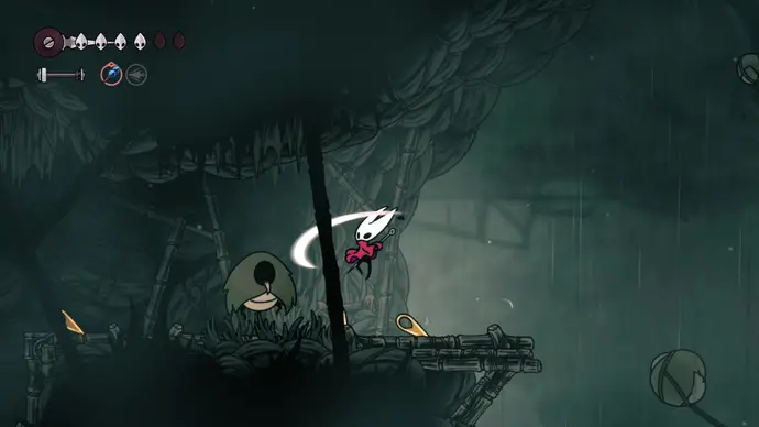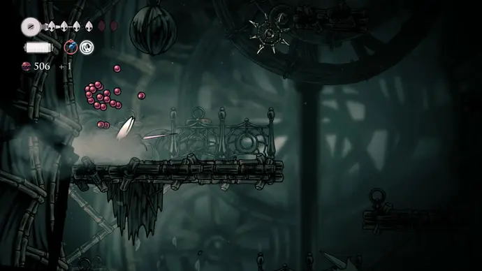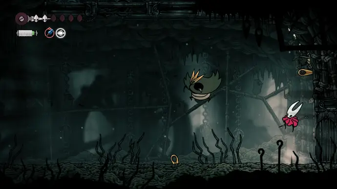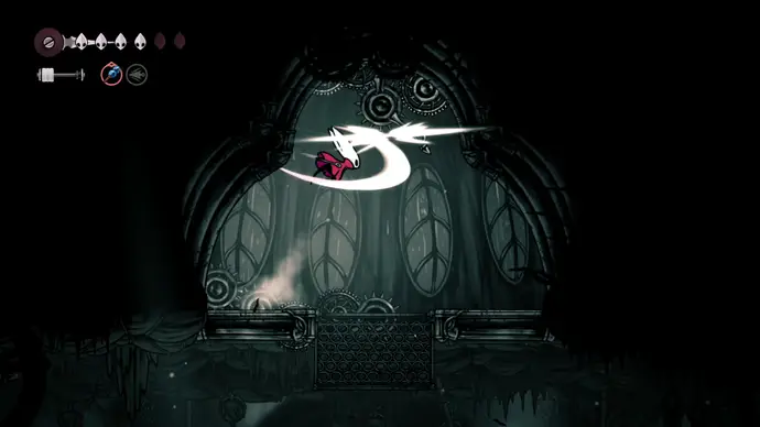 Спуститесь чуть ниже на уступ слева от пил и пройдите в следующую комнату. Подпрыгивайте по шарам, избегая шипов, и ударьте по рычагу, чтобы создать ещё один воздушный поток вверх, ведущий к шёлку. Продолжайте подпрыгивать влево и очистите платформу от врагов. Ниже есть ещё один рычаг для активации очередного воздушного потока.