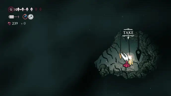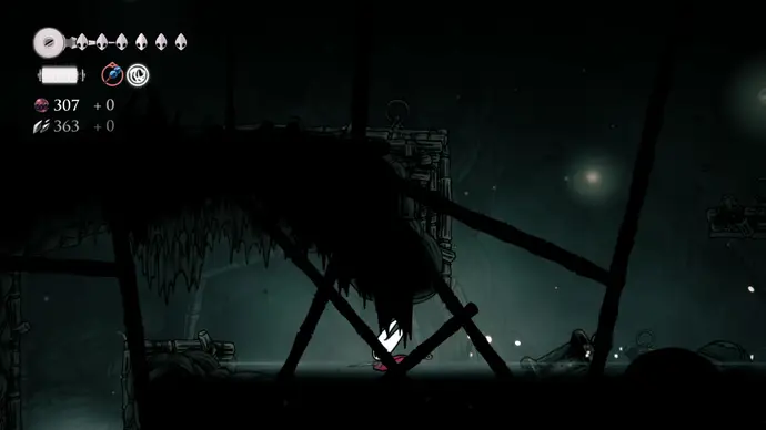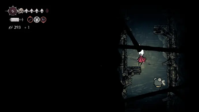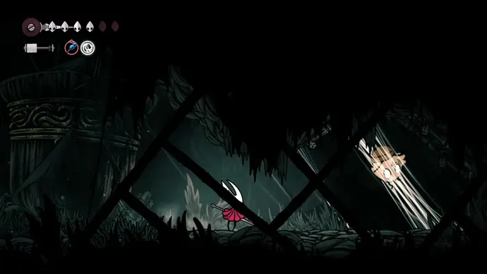 В следующей комнате, патрулируемой слепыми Порхающими Клещами, (Fluttermites) заберитесь по стене наверх за тайником бусин, затем следуйте по потолку, чтобы добраться до ниши, охраняемой Шёлкорезом с огромными ножницами. Убейте его и возьмите Связку Осколков в конце.