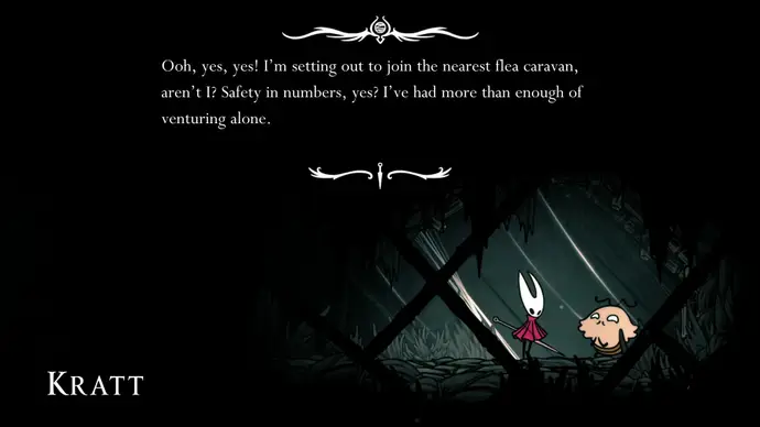 Перейдите следующую комнату, и найдёте необычную блоху, запертую в паутине. Атакуйте паутину, чтобы освободить блоху. Это полноценный персонаж по имени Кратт, который скажет, что встретит вас в караване блох.