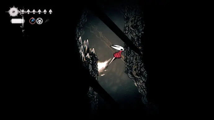 Победив Фантома, идите влево и войдите в лифт, который поднимет вас далеко вверх и наружу. Оттуда спуститесь по пути, и попадёте в длинный скальный ствол, полный шипов, который нужно преодолеть.