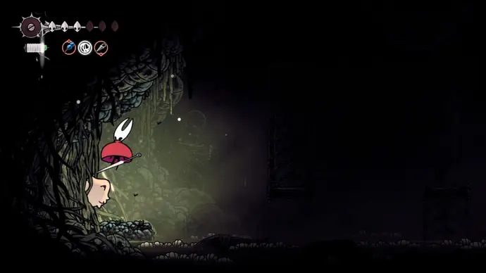 Внутри пройдите через короткий коридор, мимо врага Драпи, пока комната не откроется. Заберитесь на левый уступ и поднимитесь по стене наверх. Здесь найдёте скамейку, покрытую паутиной. Атакуйте паутину, чтобы убрать её, и отдохните на скамейке.