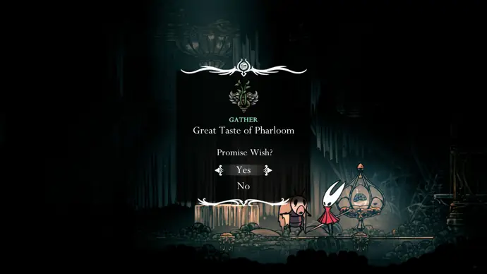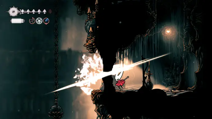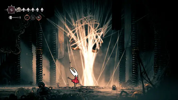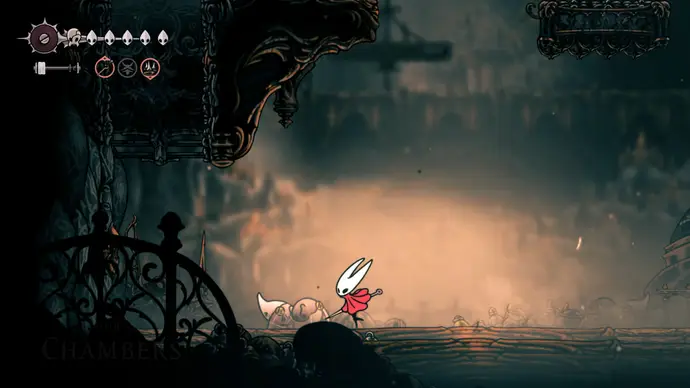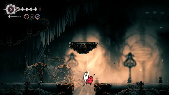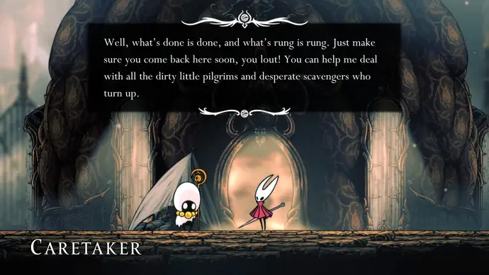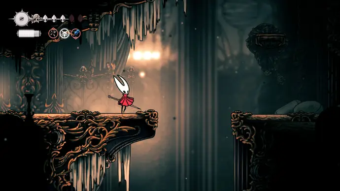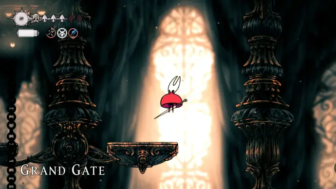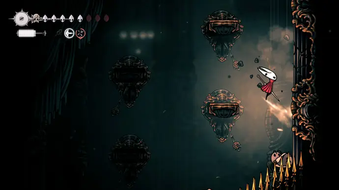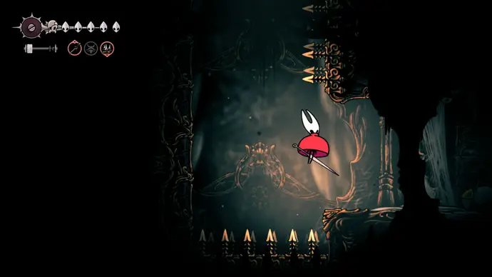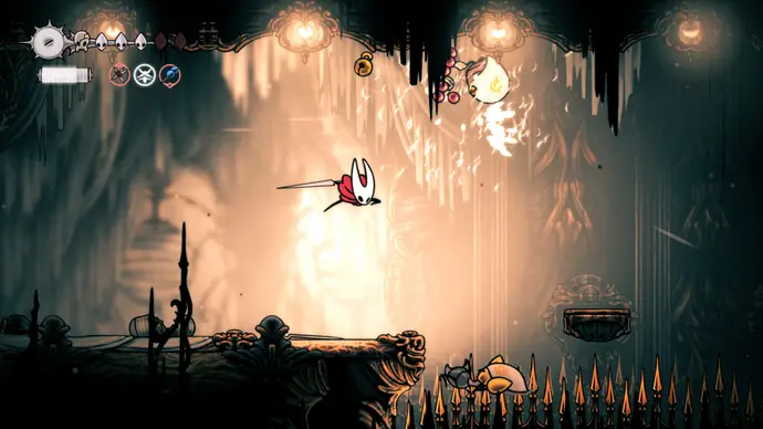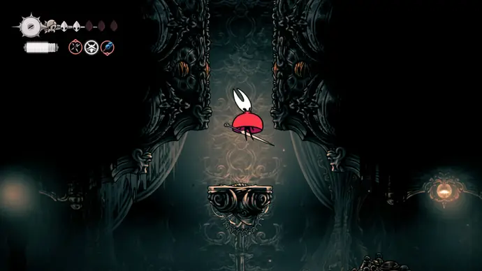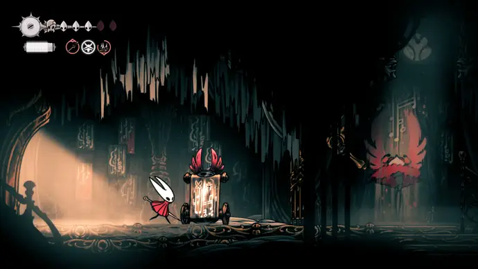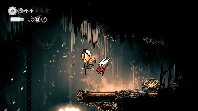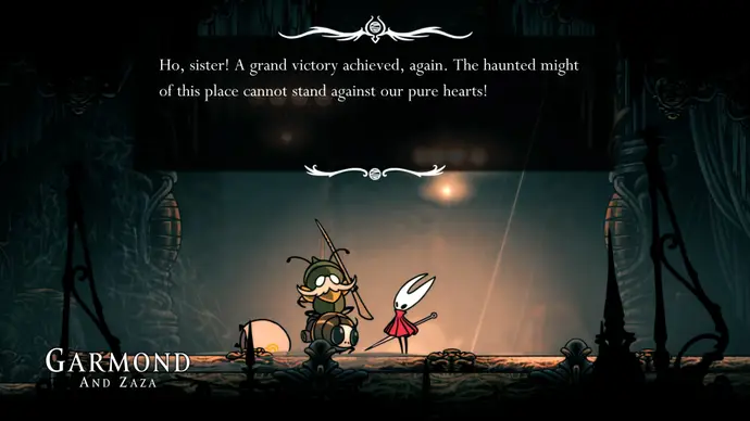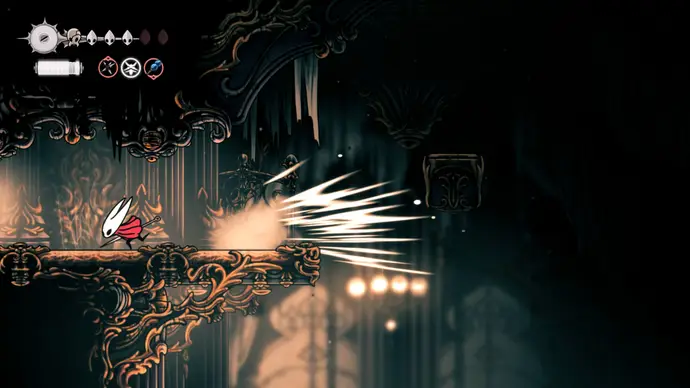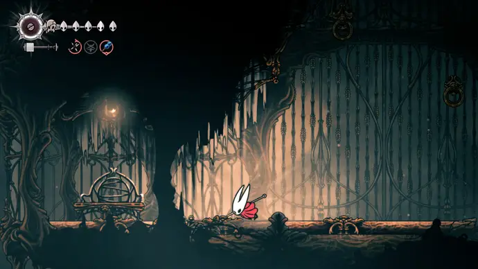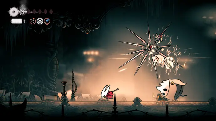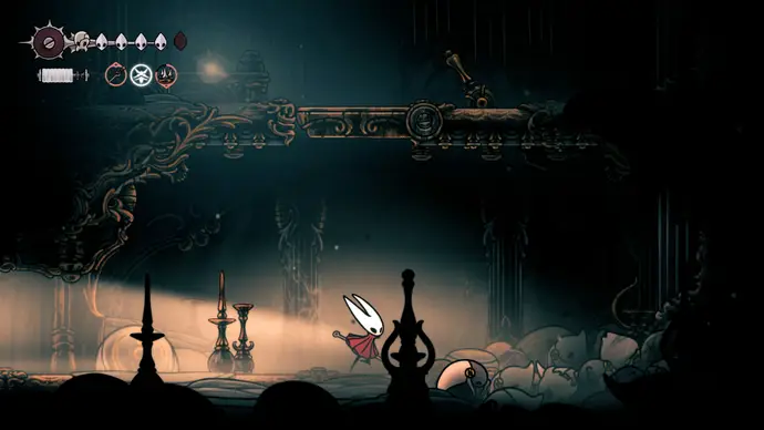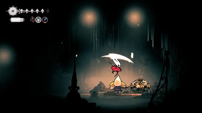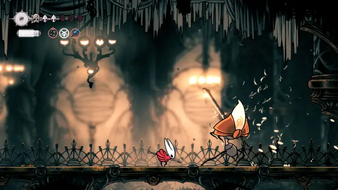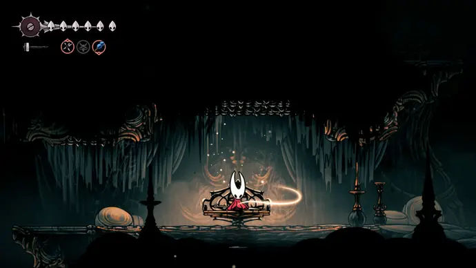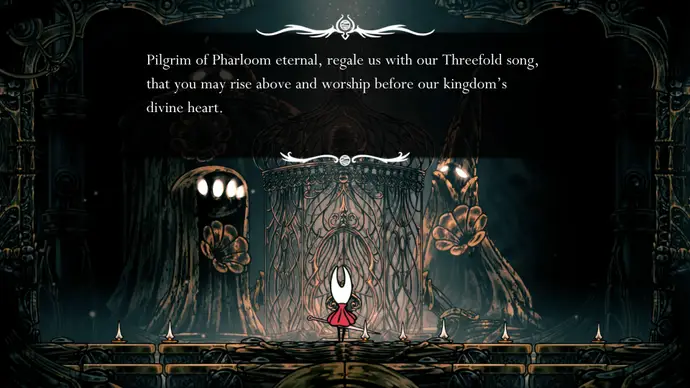 Убив одного, второй перейдёт в очень тоскливую (и несложную) финальную фазу, заставляя вас чувствовать себя ужасно ещё несколько секунд. Убейте второго Танцора, и комната задрожит, открывая богато украшенный лифт. Взаимодействуйте с ним, чтобы продвинуть главный квест Хорнет в Silksong: теперь нужно найти три части Тройной Мелодии и исполнить их здесь; после этого можно подняться на лифте в Шпиль, чтобы сразиться с финальным боссом второго акта.