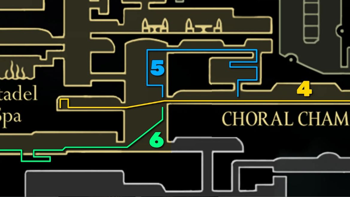 Убейте двух Хористоров в коридоре и перейдите в комнату за ним. Затем спуститесь к нижнему левому выходу (остерегайтесь шипов на полу). Спуститесь в дыру в следующей комнате и следуйте по пути вправо, чтобы добраться до скамейки для отдыха. Продолжайте мимо скамейки, чтобы войти в западную часть Спа Цитадели.