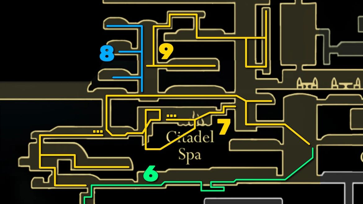 Вернитесь в Спа Цитадели и выйдите в вертикальную шахту справа. Затем прыгните и выберите левый выход на один уровень выше текущего положения, чтобы снова войти в тот же маленький коридор. Пройдите через него в следующую комнату, но на этот раз заглянем в три левые комнаты выше пути на уровне земли, который вёл в Спа Цитадели.