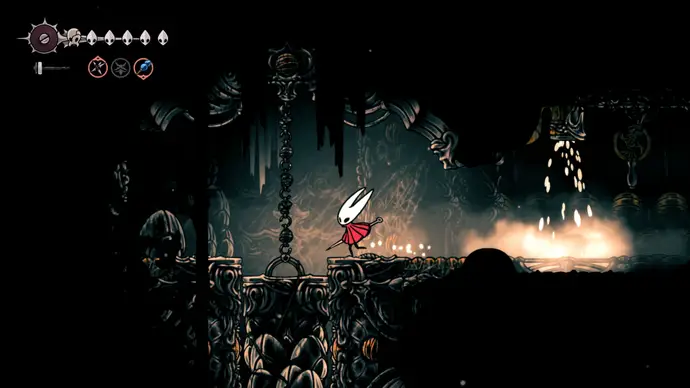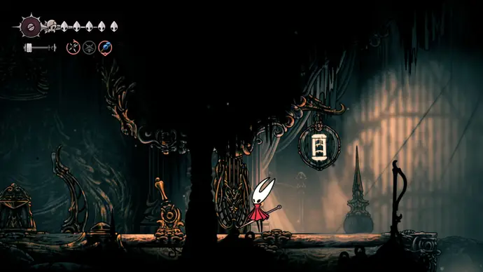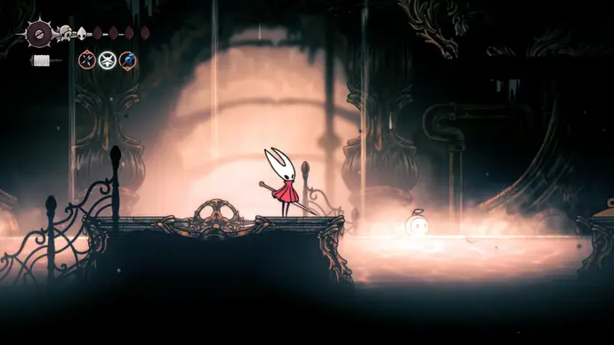 Следующая комната полна маленьких коридоров, где нужно уклоняться от паровых шахт, как в Выпускном органе. Пройдите в следующую комнату и сразу заберитесь по стене над вами. Используйте уступ, чтобы добраться до верхней комнаты, и слева сможете заплатить 80 бусин, чтобы активировать новую станцию Вентрики (и лёгкий путь вниз к Великому Колокольному Пути). Пока не используйте её.