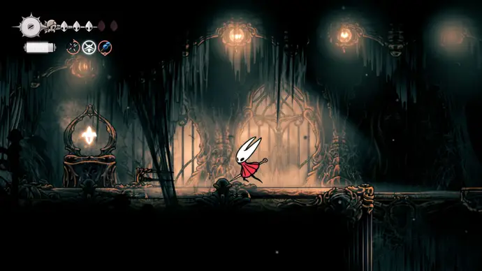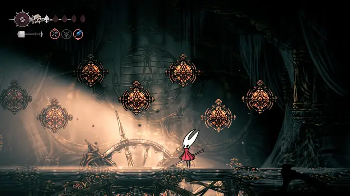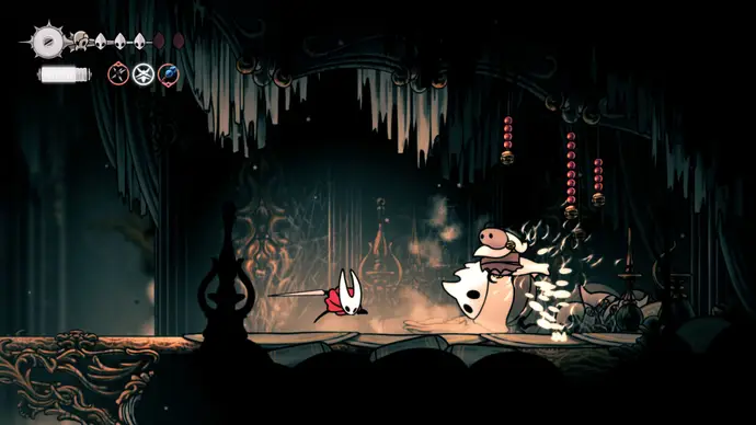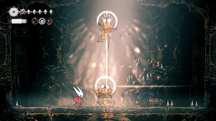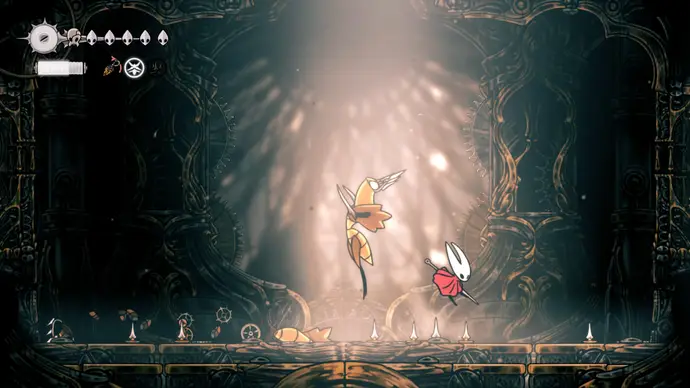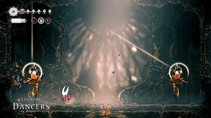 Выйдите в следующую комнату и спуститесь в арену в центре, чтобы запустить главный бой Хоровых Палат и один из любимых боссов во всей Silksong: Заводных Танцоров.
