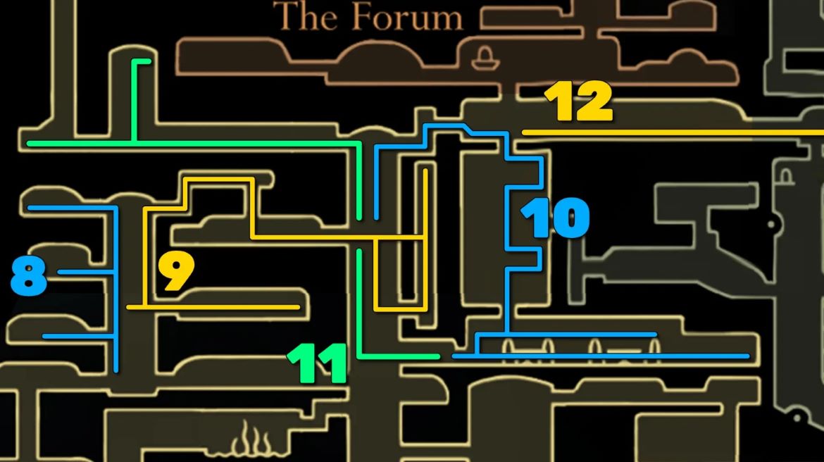 Не падайте вниз — вместо этого используйте качающиеся платформы в комнате, чтобы добраться до верхнего левого уступа, где можно взять Фрагмент Катушки. Затем вернитесь тем же путём. Если упали вниз, придётся вернуться к Колокольному Пути Подточенных Ступеней, переместиться в Великий Колокольный Путь и повторить шаги.