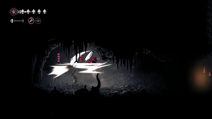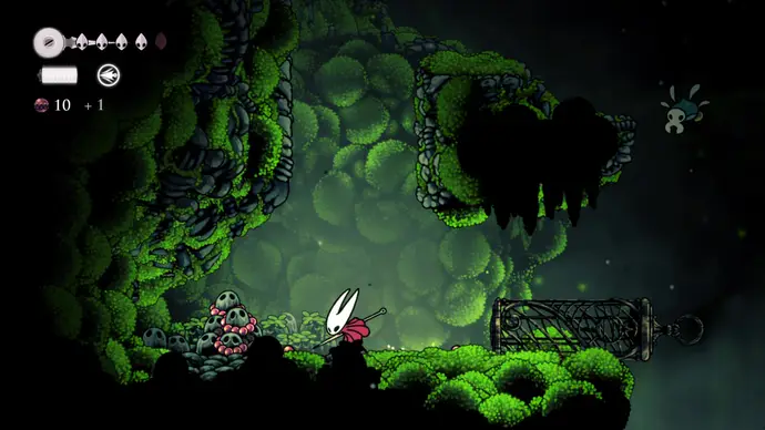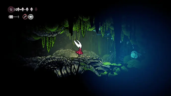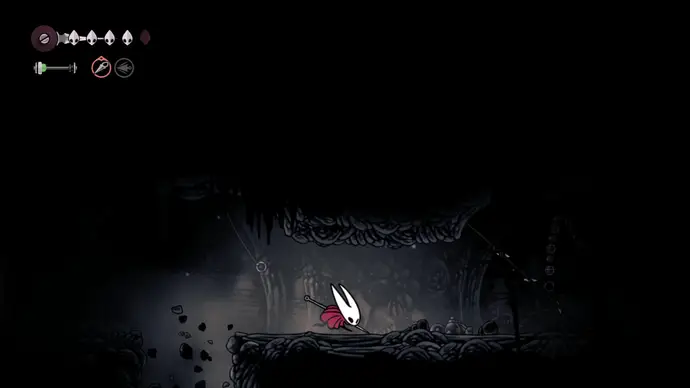 Атакуйте правую стену, чтобы открыть маленькую скрытую зону с первым Осколком маски. Сбор четырёх осколков навсегда увеличивает максимальное здоровье Хорнет на 1, что делает их ценным ресурсом.