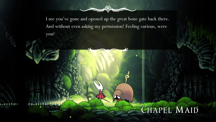 Разобравшись с ними, идите вправо и атакуйте дверь в конце комнаты, чтобы открыть её. Вы вернётесь к Прислужнице Капеллы, которая оживила вас после Мшистого грота. Поговорите с ней, затем возвращайтесь в Костяную Низину для заслуженного отдыха.