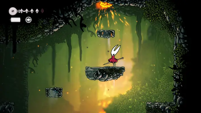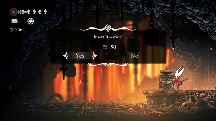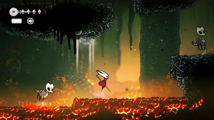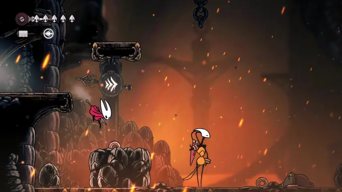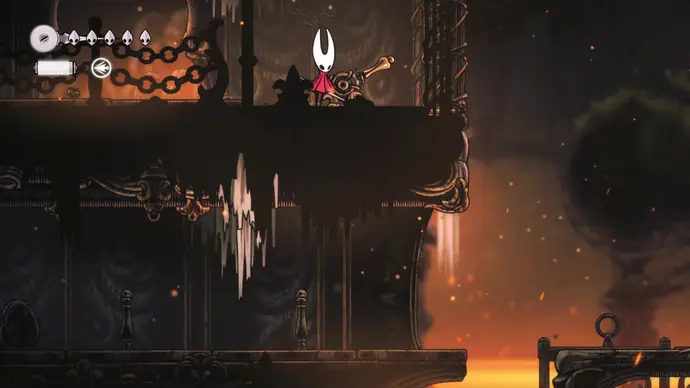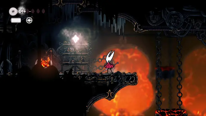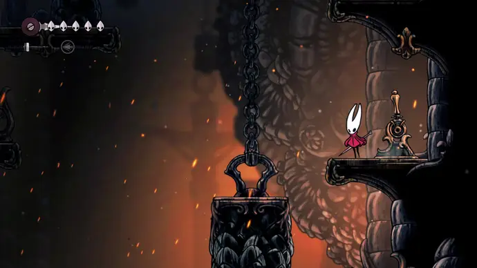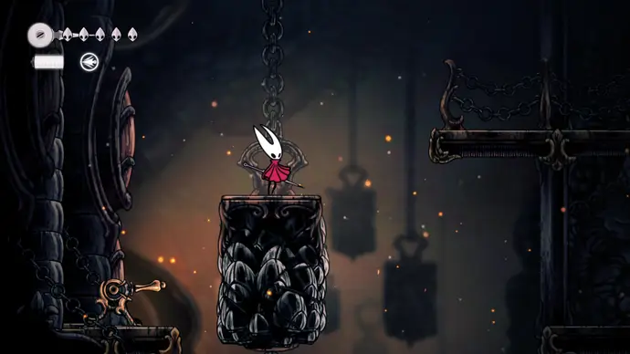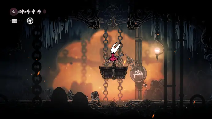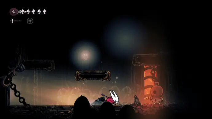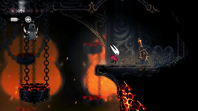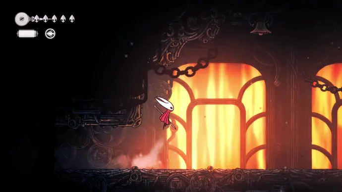 Перед продолжением перепрыгните Колокольного Зверя и атакуйте левую стену комнаты Колокольного пути, чтобы открыть секретный проход. Внутри — простая головоломка с платформами, где нужно рассчитать прыжки, избегая падающих потоков лавы.