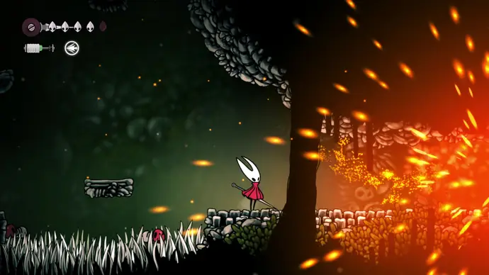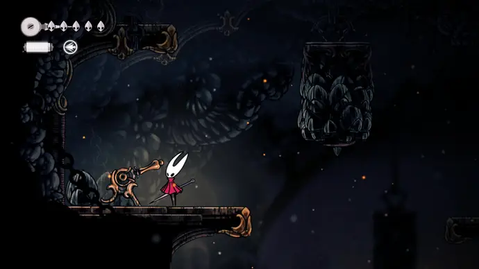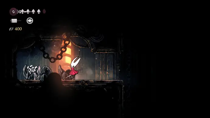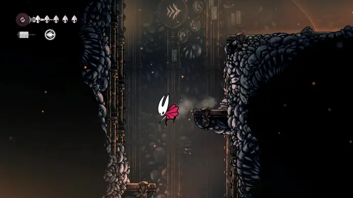 Используйте подвесные платформы, чтобы достичь верхнего правого уступа, и ударьте по рычагу, чтобы переместить все уступы. Затем вернитесь по ним, и вы сможете достать верхний уступ слева с Осколком катушки. Вместе с тем, что вы собрали в Мохоуме, это навсегда увеличит ваш максимальный запас шёлка на всё прохождение.