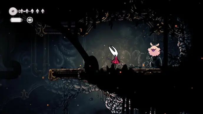 Как только Лейс будет побеждена, она исчезнет (похоже, мы увидим её снова), оставив вас свободно двигаться вправо. Ударьте по рычагу в следующей комнате, чтобы прозвучал колокол победы и разблокировалась новая скамья и путь вперёд в совершенно новую зону — Дальние поля.