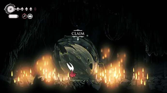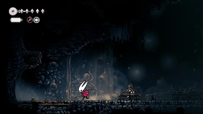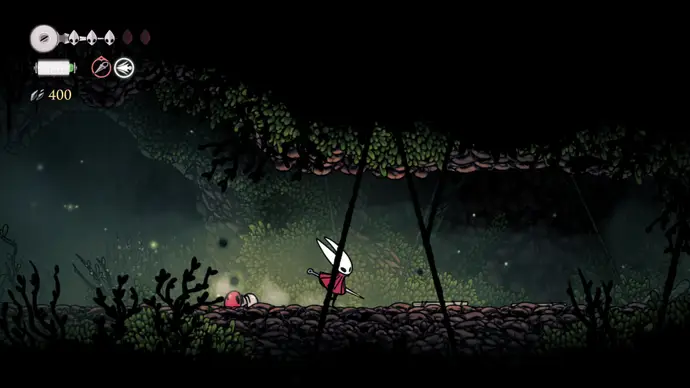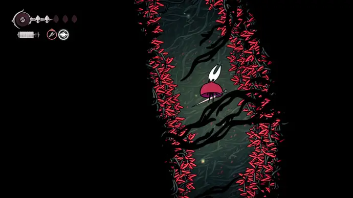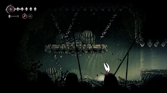 Настоятельно рекомендуется переключиться в этой области на Герб Странника, потому что — вместе с новой механикой парения из Дальних Полей — он значительно облегчает навигацию по Пути Охотника. С практикой вы можете использовать оригинальную атаку пого Хорнет, чтобы пройти всё в Пути Охотника, так что решайте сами.