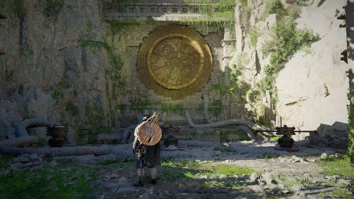 Чтобы решить загадку и открыть доступ к Древним руинам, взаимодействуйте с тремя рычагами для вращения дисков на фреске. Ваша цель — повернуть диски так, чтобы большие круги совместились с изображениями.
