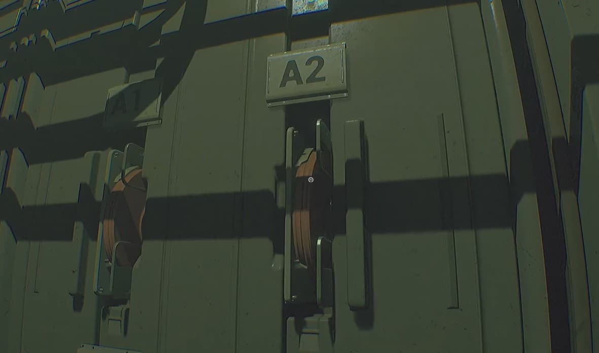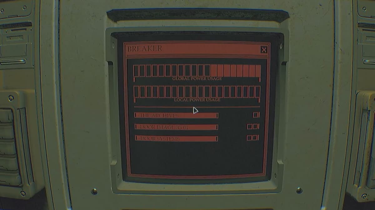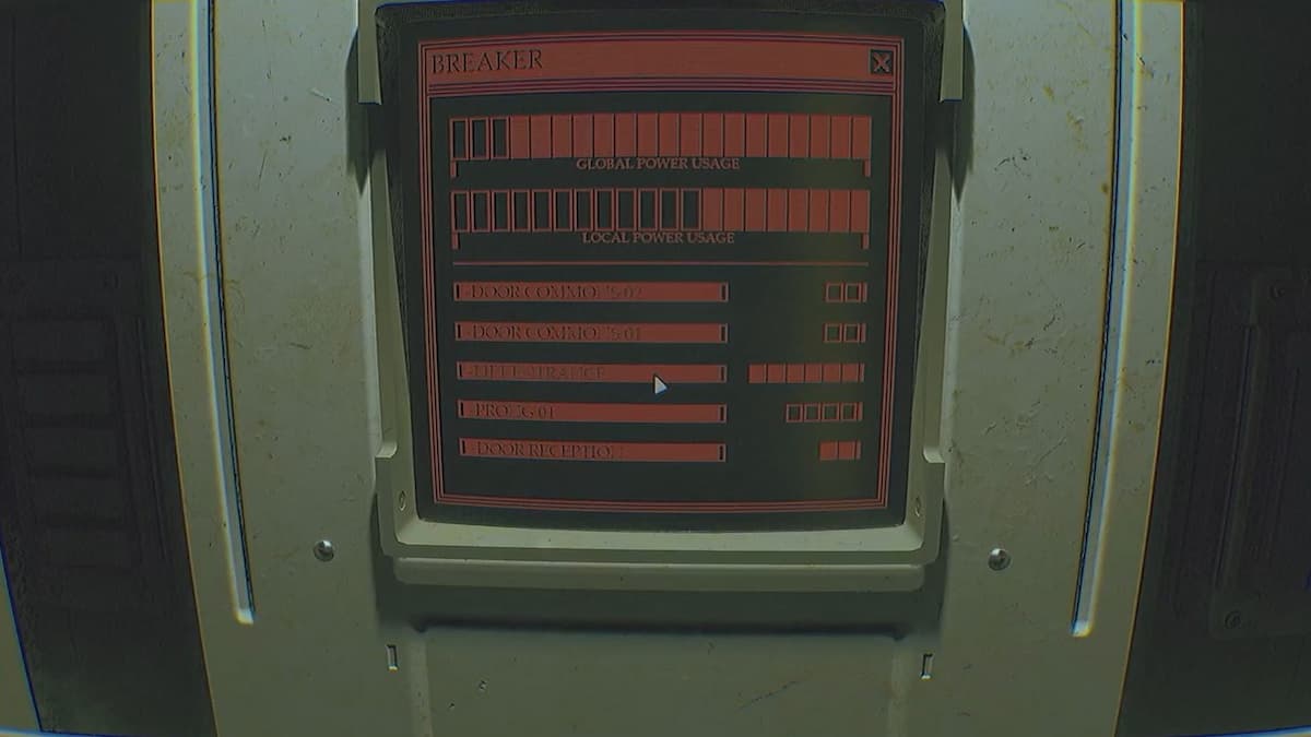 Изучив эти объекты, подойдите к блоку питания слева от стола, освещённого жёлтым светом (в конце длинной шахты). На экране терминала нажмите «Дверь приёмной», чтобы подать на неё питание.
