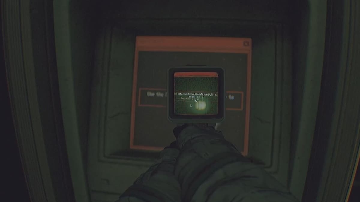 Обойдите экран сзади, и найдёте терминал (можете прослушать звуковую запись на кровати рядом). Введите ID, который был на ключ-карте, чтобы получить доступ. Во вкладке «БЕЗОПАСНОСТЬ» отсканируйте своим Модулем интерфейса, чтобы обновить его до Уровня безопасности 2.