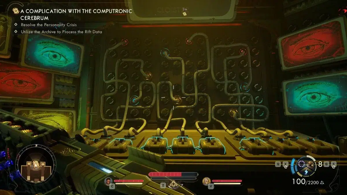 После того как вы решите, какую личность хотите восстановить в U.E.N.I.A.C., на нижнем этаже откроется новая камера. Войдите внутрь, и вы увидите консоль с несколькими переключателями и проводами впереди. Каждый провод связан с одной из трёх личностей, что отмечено цветными узлами. В зависимости от того, какую личность вы выбрали, нужно деактивировать переключатель, соответствующий этому узлу.