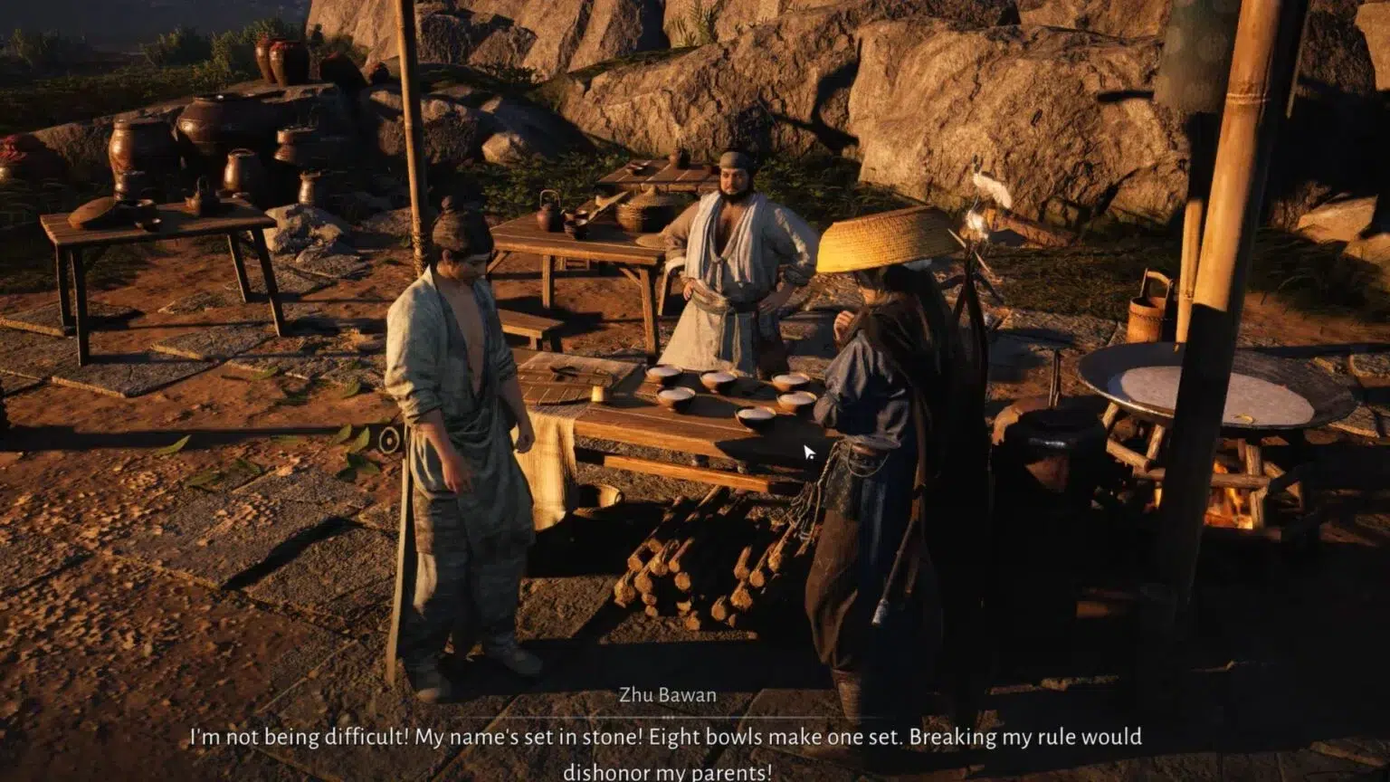 Это заметно при разговоре с Чжу Баваном. Сначала его отчуждённость заставляет расспрашивать его ещё больше, пока он не признаётся, что ему действительно нужно: 8 чаш Цинхэ, чтобы обслуживать своих клиентов.