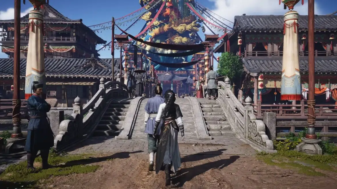 Выйдя на улицу, осмотрите интересные объекты и взаимодействуйте с ними. Вы наткнётесь на узор Лунга с изображением дракона. Руби прокомментирует это, что даст подсказку о дальнейших действиях. По пути можно подобрать копьё — один из видов оружия в Where Winds Meet.