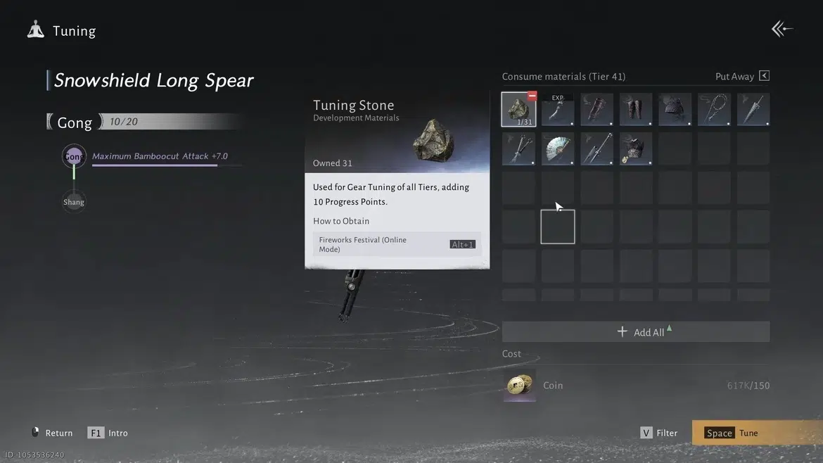 Весь процесс требует ресурсов. Можно использовать специальные Камни тюнинга (Tuning Stones) — этот материал предназначен исключительно для данной механики. Если же вы не хотите тратить камни, разрешается использовать другие предметы снаряжения в качестве «топлива» для улучшения основной вещи. Имейте в виду, что любые предметы, затраченные в процессе, будут безвозвратно поглощены.