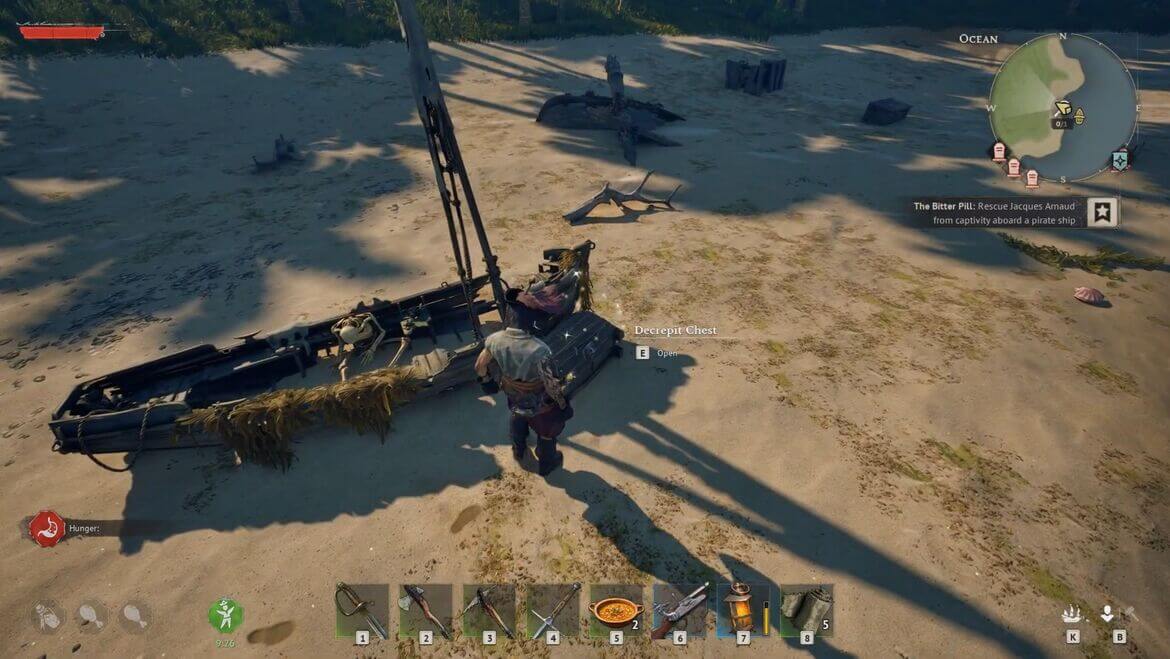 Мы нашли редкую дуэльную саблю в ветхом сундуке, помеченном как «Останки пирата» (Pirate Remains). В сундуке также лежал размытый эскиз острова, который начал квест «Пятнадцать человек на сундук мертвеца».