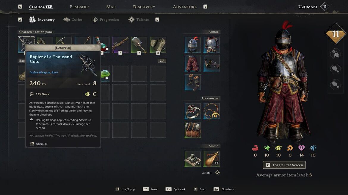 Рапира тысячи порезов — это идеальное средство для устранения боссов в начале игры. Каждый удар этим клинком накладывает на противника эффект кровотечения, который суммируется до 5 раз. Поскольку каждый уровень эффекта наносит 25 единиц урона в секунду, при максимальном накоплении враг теряет внушительные 125 единиц здоровья в секунду.