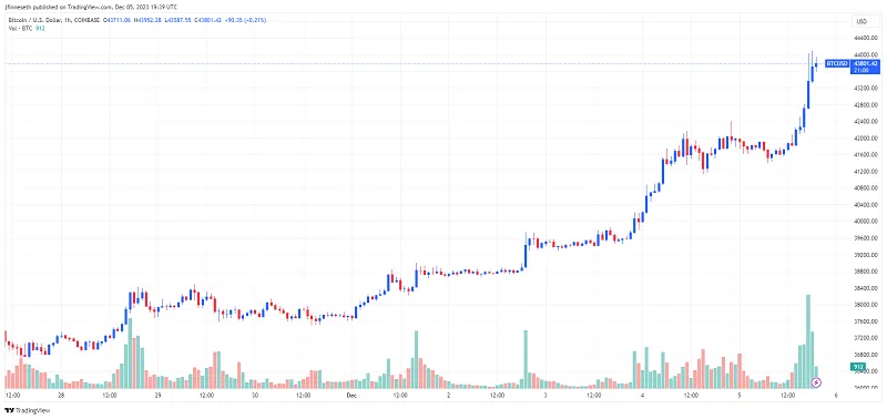 Во вторник, 5 декабря, главная криптовалюта продолжила свой рост. Курс биткоина на короткое время превысил $44000 и составлял максимум $44400 на главных криптовалютных биржах, включая Coinbase. В последний раз подобный курс был в апреле 2022 года. Считается, что цена растёт из-за снижения процентных ставок в США и в ожидании одобрения ETF. В момент написания новости курс биткоина был около $43700.