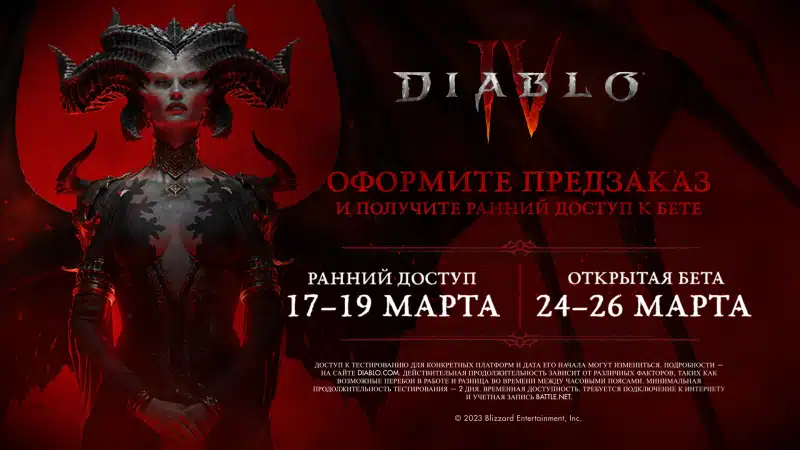 Компания Blizzard Entertainment объявила о начале открытого бета тестирования, которое пройдет с 24 по 26 марта. Вступить в битву против демонов можно будет на нескольких платформах: Windows PC, Xbox Series X|S, Xbox One, PlayStation 5, и PlayStation 4.
