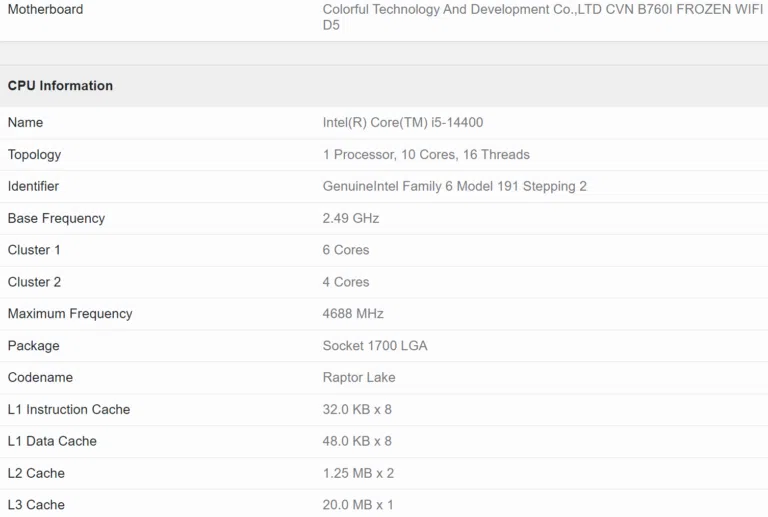 В одноядерном тестировании результат составил 2464 баллов, в многоядерном 13373 балла. Это означает прирост производительности на 8% и 29% по сравнению с Core i5-13400. При этом разница между ними заключается только в росте частоты на 200 МГц. Если для процессора прошлого поколения берутся средние результаты многочисленных тестов, то у нового чипа это может быть единственный лучший результат. В реальности разница ожидается не более 5%.