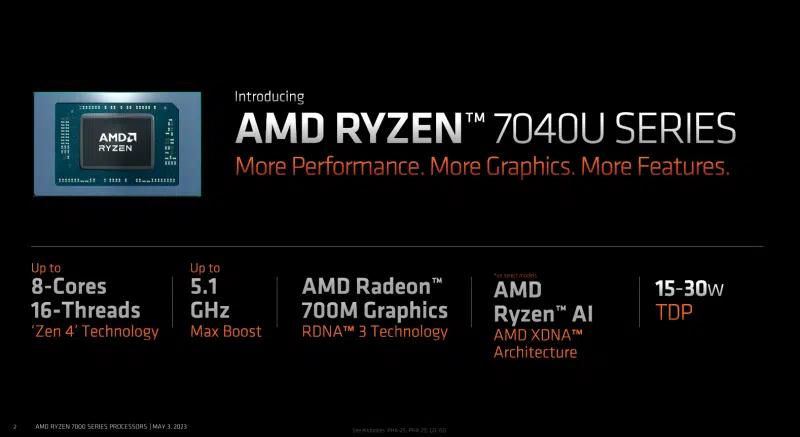 Ryzen 7 7840U оснащён 8-ядерным/16-поточным процессором с тактовой частотой 3,30 ГГц и повышением частоты до 5,10 ГГц. Ryzen 5 7640U имеет 6-ядерный/12-поточный процессор с тактовой частотой 3,50 ГГц и максимальной частотой до 4,90 ГГц. Ryzen 5 7540U отличается от 7640U не только чуть меньшей тактовой частотой процессора — 3,20 ГГц с разгоном до 4,90 ГГц, но и отсутствием функции XDNA Ryzen AI. Младшая модель Ryzen 3 7440U имеет более скромные характеристики: всего 4 ядра/8 потоков, тактовая частота 3,0 ГГц с разгоном до 4,70 ГГц, вдвое меньший объём общего кэша L3, и отсутствие Ryzen AI.