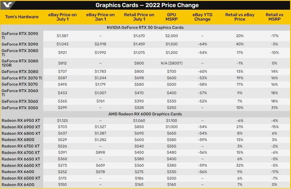 Издание Tom’s Hardware поделилось новой информацией относительно цен на видеокарты, новых и бывших в употреблении. Карты Nvidia и AMD последних на данный момент поколений становятся всё доступнее для покупки. Правда, с момента появления архитектур RDNA2 и Ampere прошло почти два года, так что не всех захотят покупать карты достаточно почтенного по меркам технологий возраста, даже по рекомендованным розничным ценам. Тем более что некоторые считают и рекомендованные цены завышенными.