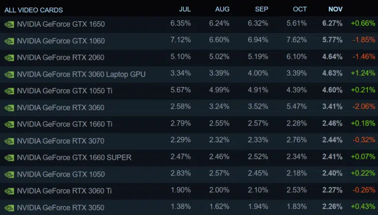 Статистика игровой платформы Steam за ноябрь показывает, что видеокарта GeForce GTX 1650 обошла давно лидировавшую модель этого же производителя GTX 1060.
