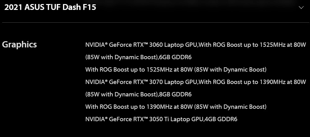 Судя по номеру модели, Nvidia может очень скоро представить четвёртый графический процессор серии 30 для ноутбуков. Ранее были выпущены карты RTX 3060, RTX 3070 и RTX 3080. На веб-сайте Asus упоминается, что карта имеет 4 Гб памяти, но ничего не говорится о тактовых частотах и других характеристиках. RTX 3050 Ti может быть бюджетной моделью с 128-битной шиной памяти и TGP 60 Вт.