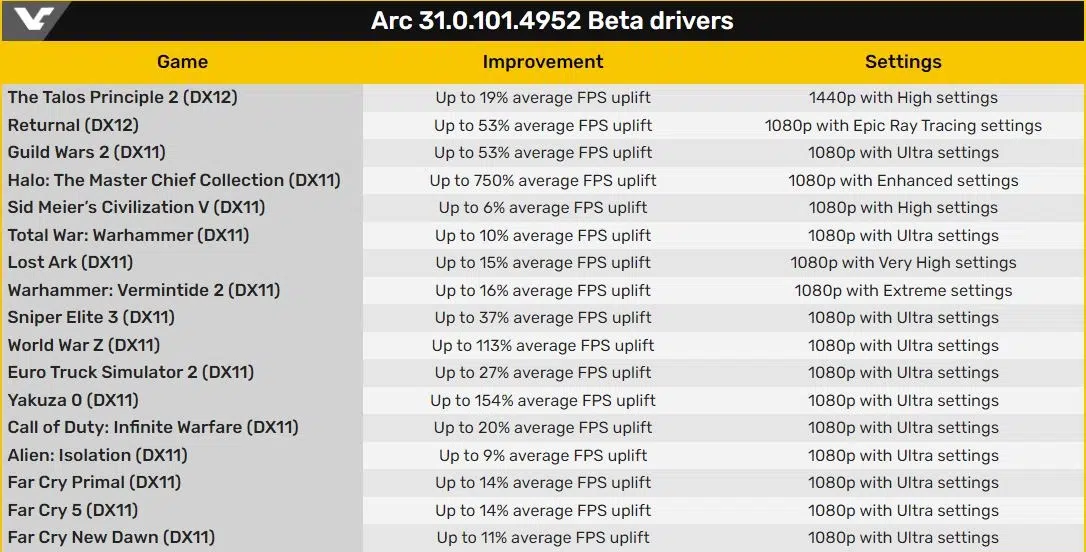 Компания Intel выпустила графический драйвер под номером 31.0.101.4952, который даёт значительный прирост производительности в 17 играх. Здесь предлагаются оптимизации для пяти новых игр, благодаря чему прирост производительности может быть двузначный и более. Сравнение ведётся с версиями драйверов 4900 или 4887. Тестирование выполнялось на высоких настройках графики или ультра, по возможности с трассировкой лучей.