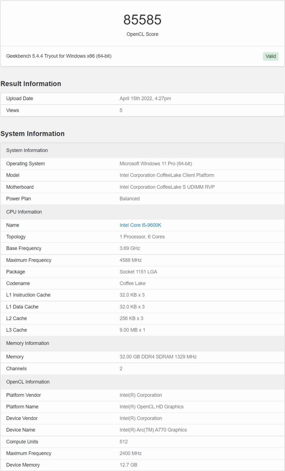 Видеокарта Intel Arc Alchemist A770 для настольных ПК уже не в первый раз была обнаружена в тесте Geek Bench OpenCL, но в первый раз с правильным названием. Данная модель представляет собой высокопроизводительную игровую карту с полноценным графическим процессором ACM-G10.