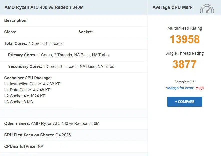 Одной из таких моделей является Ryzen AI 5 430, впервые замеченная в декабре 2025 года. Это первый результат тестирования данного процессора в PassMark, дающий представление о том, какой прирост он обеспечивает по сравнению со своим предшественником — Ryzen AI 5 330. Поскольку процессор не получил увеличения количества ядер, а большинство характеристик остаются идентичными, производительность не должна быть значительно выше, чем у предыдущей модели.