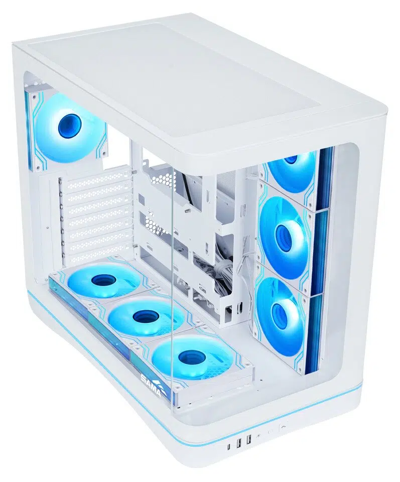 SAMA 12 марта 2026 года показала серию корпусов V62 с панорамным обзором на 270° через изогнутое закалённое стекло. Главная ставка — «витринный» дизайн без доплат: внутри уже стоят 7 ARGB-вентиляторов, а цена в Европе стартует с €99,90.